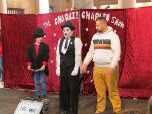 Ein Pantomime im Chaplin-Kostüm agierte vor einem