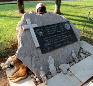 Nachdem ich diesen Zeitungsartikel gelesen und beim weiteren Suchen herausgefunden hatte, dass vier der Feuerwehrleute aus Vodice kamen, fügte sich das Puzzle zusammen: der Gedenkstein, auf dem ein Feuerwehrhelm ruht, die Dankesbezeugungen und das Wappen der örtlichen Feuerwehr neben den vier Namen.