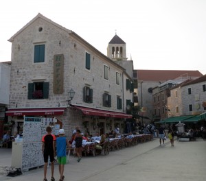 Dieser Ort taucht im Roman immer wieder auf, denn viele der Rückblenden gehen auf dieses kleine Fischerdorf zurück. So war es von der Lektüre nicht weit bis zum Vorhaben, mir diesen Ort selbst anzusehen, zumal er sich tatsächlich ganz in der Nähe der Insel Murter befindet, auf der wir einen Teil dieses Sommers verbrachten. Von einem Fischerdorf würde ich in diesem Zusammenhang allerdings nicht mehr sprechen. Wie viele andere Küstenorte auch, ist Vodice inzwischen vom Tourismus geprägt, und es bedarf einiger Phantasie, wenn man versucht, sich die Strandbars, Souvenir- und sonstigen Geschäfte wegzudenken und zumindest gedanklich den einstigen Kern des Ortes freizulegen. Hier und da findet man allerdings noch alte Gassen, die zu eng sind, als dass man ihnen mit modernen Bauten ihren Charme nehmen könnte.