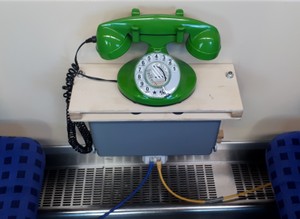 Wählscheiben-Telefone, die in den Viererabteilen des Wagens stehen. Wofür sie