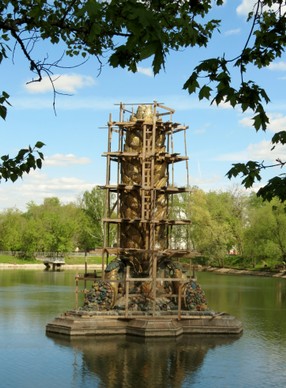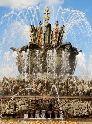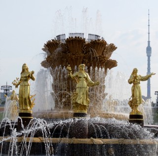 Gleich am ersten Tag meines diesjährigen Aufenthaltes machten mein Freund Timur mit seiner ganzen Familie und ich uns also per Fahrrad auf den Weg zum Park Ostankino, der unmittelbar an die Ausstellung grenzt. Unsere erste Station war, wie ich es mir gewünscht hatte, die „Goldene Ähre“ - und ich muss sagen, das Warten hat sich gelohnt! Der 1954 erbaute Springbrunnen, der in den 1990er-Jahren bereits ausgeschaltet wurde, weil er immer mehr verfiel, ist nun in voller Schönheit wiederauferstanden und macht seinem Namen alle Ehre. Aus der Ähre, die selbst 16 Meter hoch ist, schießen 66 bis zu 25 Meter hohe Fontänen. Die Füllhörner am Fuße der Ähre sind zwar bunt, aber nicht aufdringlich, was in Moskau derzeit nicht hoch genug geschätzt werden kann.