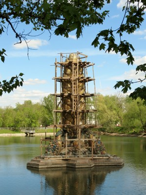 Das zweite nicht zustande gekommene Foto ist schon etwas ärgerlicher, weil ich nach dem Springbrunnen, den es eigentlich in voller Schönheit zeigen sollte, schon wesentlich länger gesucht habe. Nun habe ich ihn endlich mit der Hilfe eines Freundes gefunden (allein hätte ich sicher noch ein paar Moskau-Aufenthalte mehr dafür gebraucht, weil der Brunnen so abgelegen ist), doch auch die „Goldene Ähre“ ist ebenso hinter einem großen Baugerüst verschwunden wie der Hauptpavillon und der Kosmos-Pavillon der Volkswirtschaftsausstellung WDNCh und viele andere kleinere Gebäude auf demselben Gelände. Da ist auch eine Aufschrift wie „Heute eine Baustelle, morgen Geschichte“ nur wenig trostspendend.