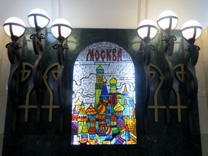 An den einzelnen Zugängen gab es auch noch halbrunde Mosaike. Bei diesen war nur die Höhe das Problem, in der sie angebracht sind. Man hätte sie am besten auf der Rolltreppe stehend im Hinunterfahren fotografieren sollen, aber wer einmal versucht hat, gegen eine Bewegung von außen (im Bus, auf einem Boot etc.) anzukommen, weiß, wie schwierig das ist, dabei den richtigen Winkel zu treffen. Nun ist es in Moskau so, dass die meisten Stationen über vier Rolltreppen pro Eingang verfügen, von denen je nach Bedarf zwei in eine Richtung (nach unten oder nach oben) und eine in die andere fahren, während die vierte in der Regel steht, offenbar als „eiserne Reserve“.
